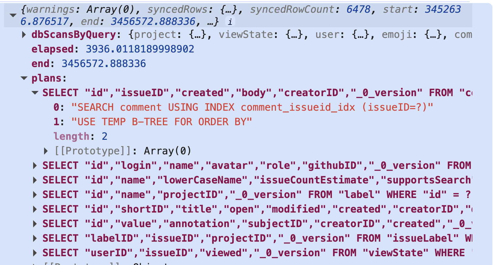 | `plans` | The output from SQLite's [`EXPLAIN QUERY PLAN`](https://www.sqlite.org/eqp.html) for each SQLite query used, which can help you understand why the query is reading more rows than necessary |