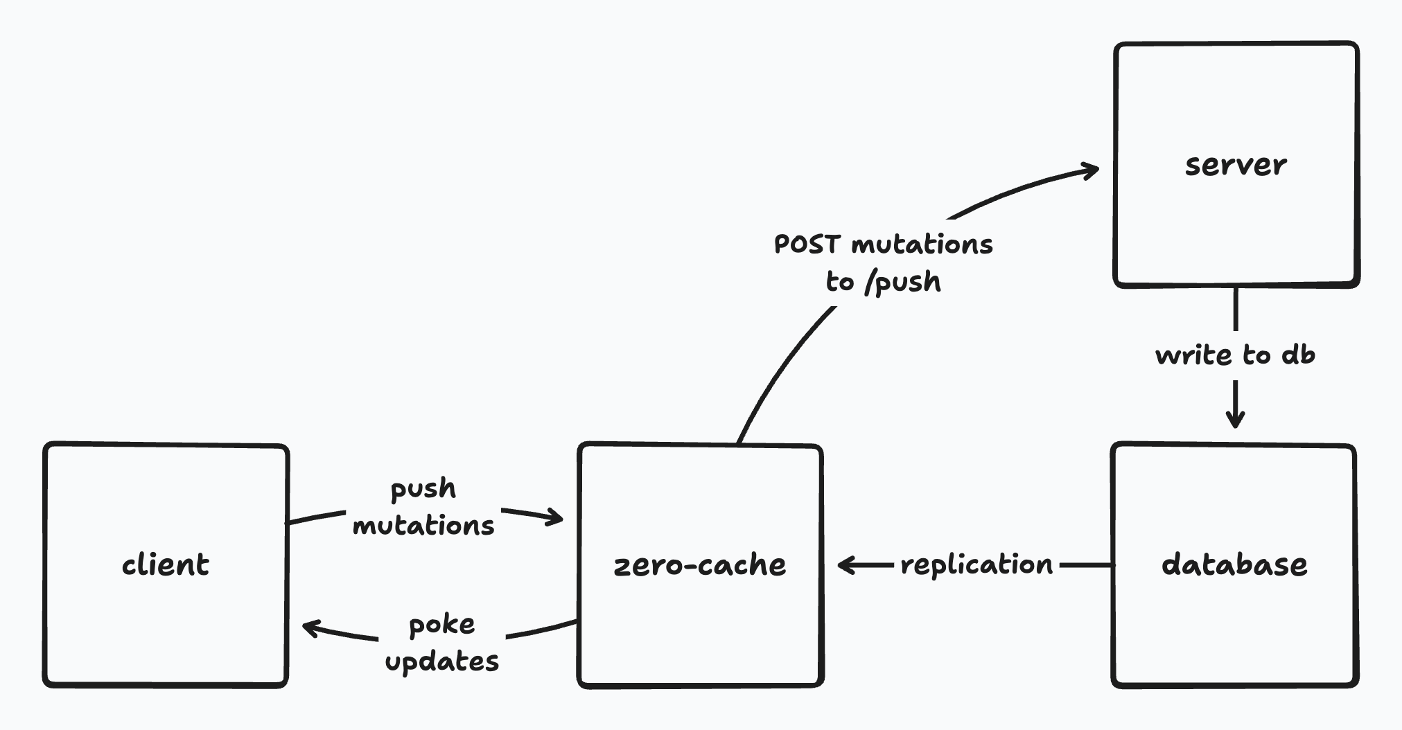 The changes to the database are then replicated to zero-cache using logical replication. zero-cache calculates the updates to active queries and sends rows that have changed to each client. It also sends information about the mutations that have been applied to the database.